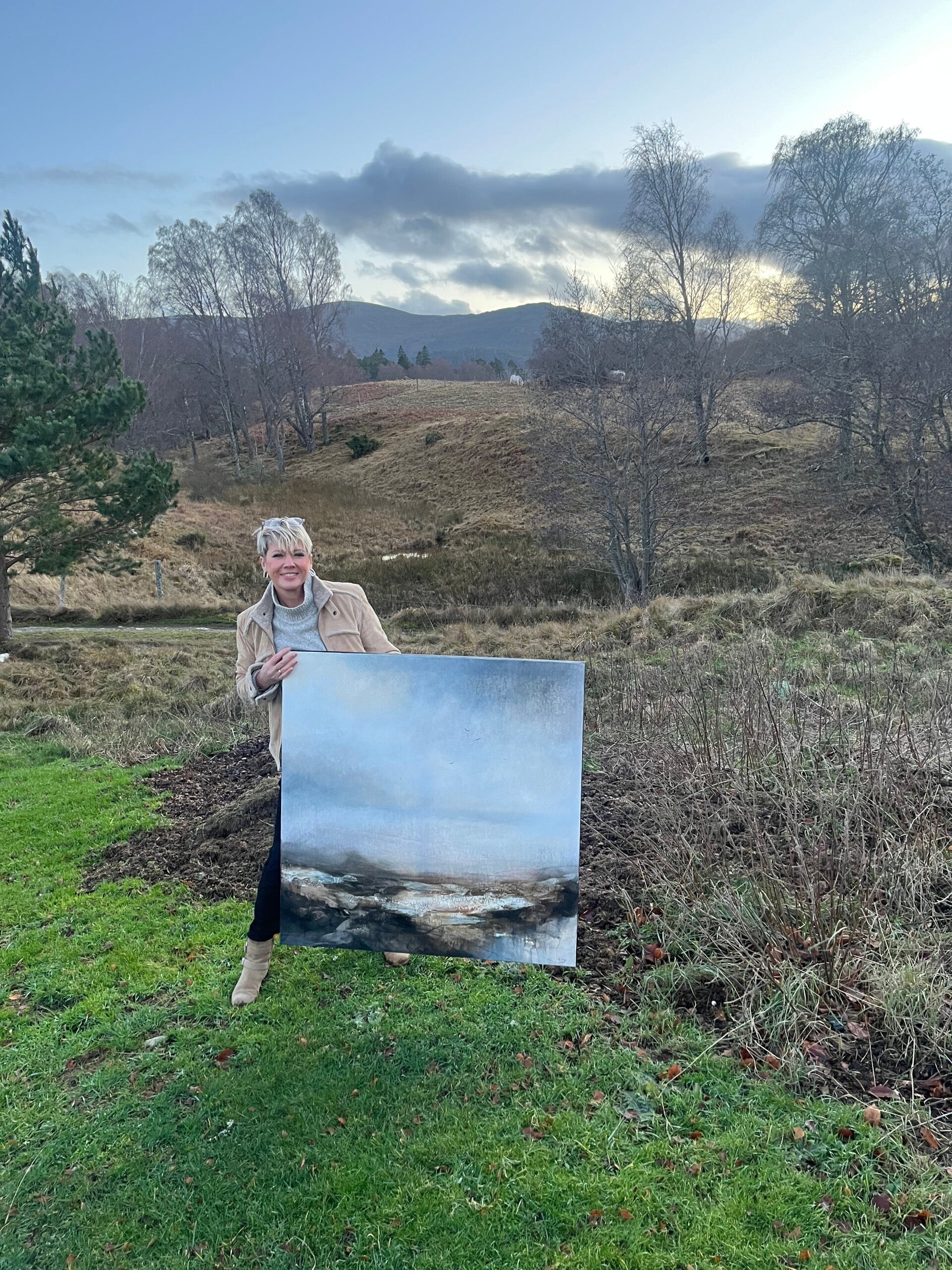 "My artistic process is deeply rooted in the local landscape where I live and work. My studio, nestled at my home on the Rothiemurchus Estate just outside Aviemore, serves as my sanctuary. I work mainly intuitively, yet this intuition is profoundly informed by my journeys throughout the breathtaking Scottish Highlands, which constantly fuel my creative spirit."